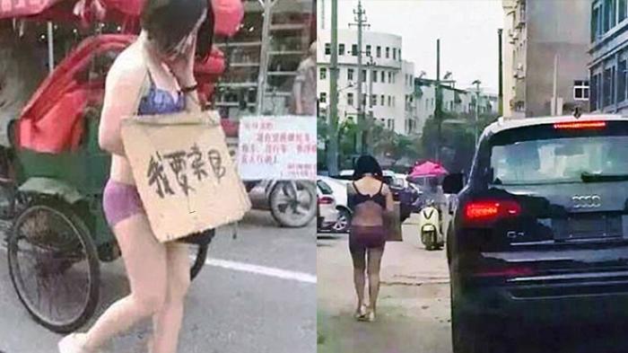 Wang Ni (33) nama istri Zhang, akhirnya jadi tontonan orang-orang. Ia berjalan hanya dengan mengenakan celana dalam dan bra saja.