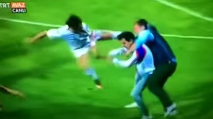 Dikutip SURYAMALANG.COM dari metro.co.uk (1/5/2016), ‘tendangan kung-fu’ ini terjadi saat pertandingan antara Sanica Boru Elazıgspor melawan Karabukspor.
