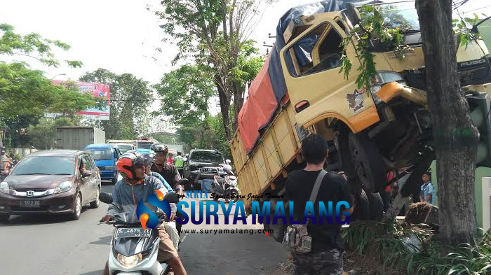 SURYAMALANG.COM, JOMBANG - Sebuah truk bermuatan minuman ringan mendadak oleng lalu menabrak pohon, di Jalan Soekarno-Hatta, Desa Mancar, Peterongan, Jombang, Sabtu (25/6 /2016).