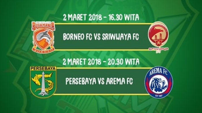 1. Borneo FC vs Sriwijaya FC, Jumat (2/3/2018) pukul 15.30 WIB.