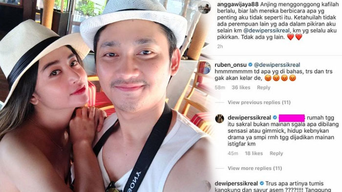 Angga Wijaya juga menuliskan caption seperti ini: Anjing menggonggong kafilah berlalu, biar lah mereka berbicara apa yg penting aku tidak seperti itu. Ketahuilah tidak ada perempuan lain yg ada dalam pikiran aku selain km @dewiperssikreal, km yg selalu aku pikirkan. Tdak ada yg lain. (emot)