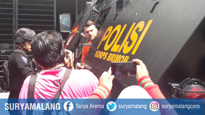 Pemain Persija Jakarta tiba di markas Persebaya, Stadion Gelora Bung Tomo (GBT) Surabaya menggunakan dua mobil kendaraan rantis, Minggu (04/11/2018).