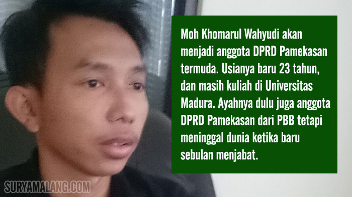 Moh Khomarul Wahyudi menjadi calon legislatif (Caleg) termuda di Pamekasan, Pulau Madura. Usianya baru 23 tahun, masih mahasiswa.