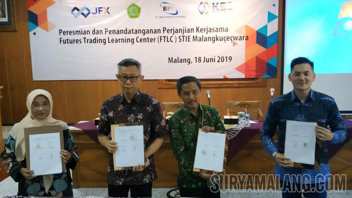 Penandatanganan kesepakatan dilakukan di STIE Malangkucecwara, Selasa (18/6/2019). FTLC menjadi pusat kegiatan ilmiah, informasi dan sosialisasi perihal Perdagangan Berjangka Komoditi sekaligus wadah pembinaan kewirausahaan serta profesionalisme bagi mahasiswa dan pengajar di lingkungan kampus.