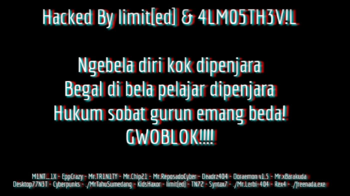 Laman jadi berwarna hitam dengan kalimat "Ngebela diri kok dipenjara. Begal dibela, pelajar dipenjara. Hukum sobat gurun emang beda. Gwoblok!!!.