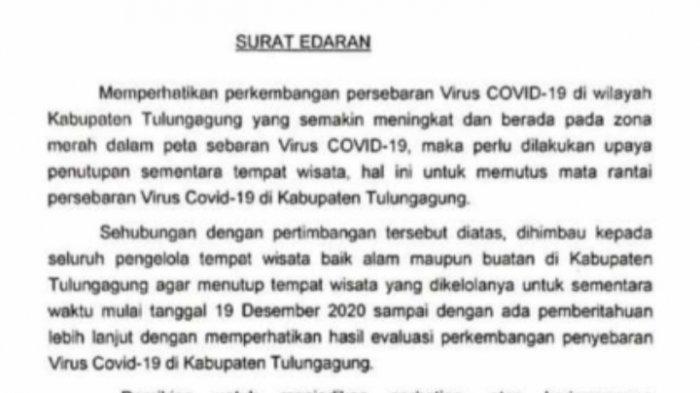 Bupati Tulungagung selaku ketua Satgas Percepatan Penanganan Covid-19 sudah mengeluarkan surat edaran penutupan sementara destinasi wisata.