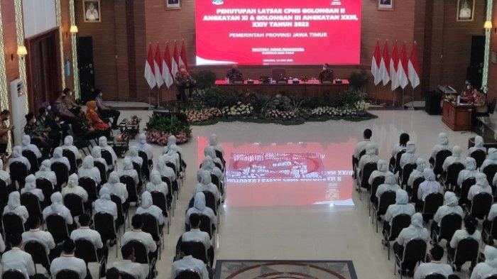 Gubernur Jawa Timur (Jatim), Khofifah Indar Parawansa menutup latihan dasar (latsar) CPNS Golongan II dan III tahun 2022 di gedung BPSDM Malang.
