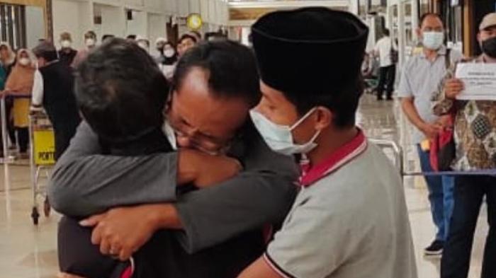 Dalam foto-foto yang diterima SURYAMALANG.COM, Muhadi dan dua anaknya langsung berpelukan ketika bertemu di terminal kedatangan 1, Bandara Juanda Surabaya di Sidoarjo, Selasa (28/6/2022) sore.