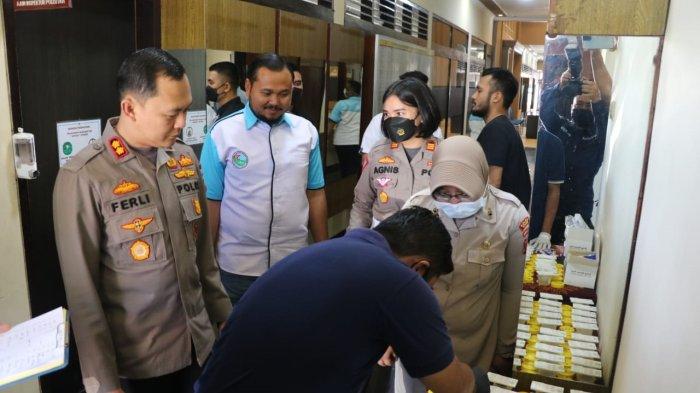 Kapolres Malang, AKBP Ferli Hidayat beserta jajaran menjalani tes urine untuk mengantisipasi penyalahgunaan narkoba di lingkungan Polri