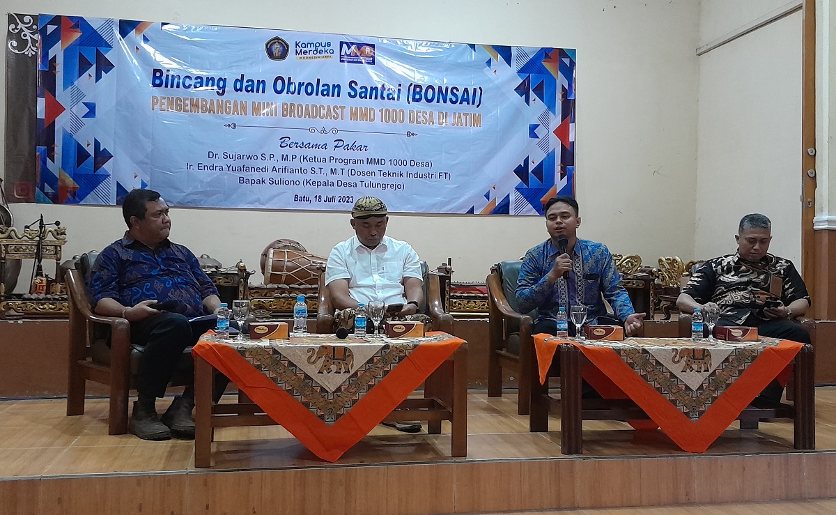 Saat ini, sudah dua pekan 13.600 an mahasiswa UB sedang mengikuti program MMD di 1000 desa di Jawa Timur. Hal ini itu menjadi pembahasan dalam Bincang dan Obrolan Santai (BONSAI) yang digagas humas UB bersama pakar UB. Kegiatan diadakan di Balai Desa Tulungrejo Kota Batu, Selasa (18/7/2023).