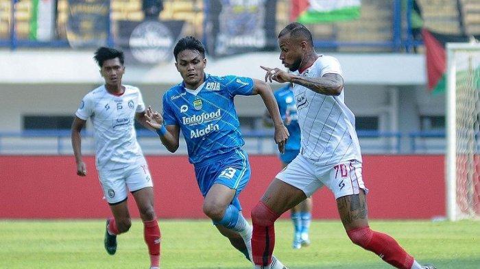Tendangan keras Gustavo Almeida sukses bersarang di gawang Persib Bandung yang dijaga oleh Teja Paku Alam.