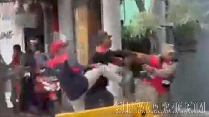 Massa buruh menendang dan menginjak-injak 2 anggota Satpol Surabaya, Kamis (30/11/2023). Federasi Serikat Pekerja Metal Indonesia minta maaf.