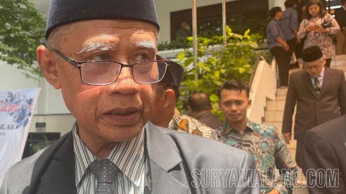 SURYAMALANG.COM, MALANG - Ketua Umum PP Muhammadiyah Prof Haedar Nashir memberikan pesan menjelang pemilu usai mengikuti pelantikan rektor baru Universitas Muhammadiyah Malang (UMM), Prof Nazaruddin Malik, Senin (12/2/2024).
