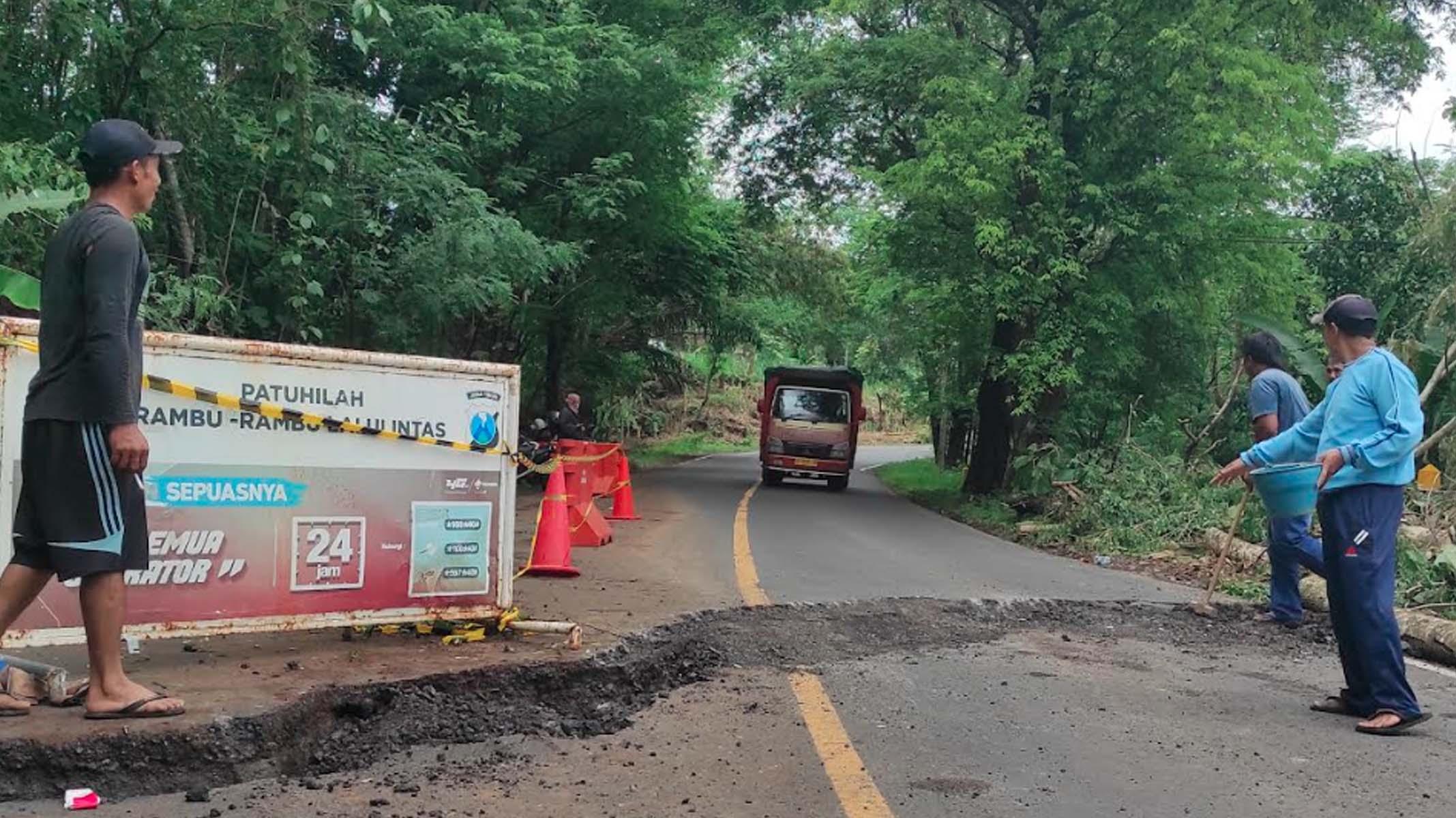 Kondisi badan jalan yang ambles membahayakan kendaraan yang melintas di lokasi.