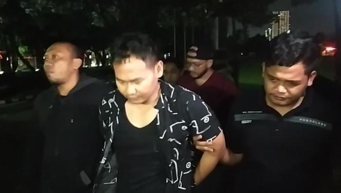 Tersangka RTH tampak turun digelandang oleh beberapa orang anggota kepolisian berpakaian sipil. Penampilannya kasual saat digelandang.