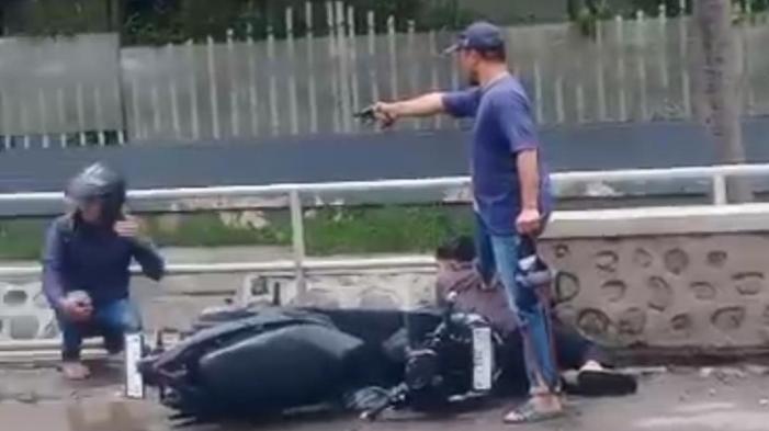 Pelaku yang ditodong senjata api itu terlihat seperti ketakutan dan meminta ampun kepada petugas tersebut, sedangkan satu pelaku lainnya sudah terkapar terlebih dahulu.