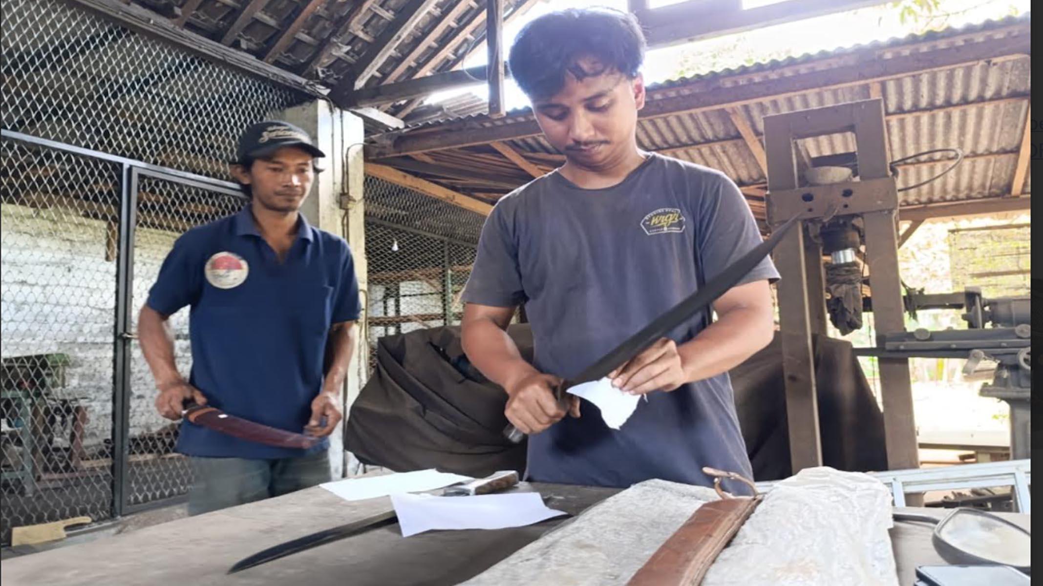 Rama tampak mengecek beberapa pisau yang sudah selesai diproduksi untuk memastikan kualitasnya tetap terjaga.