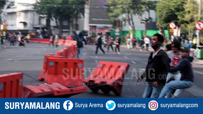 Aksi pemblokiran Jalan dilakukan massa pendemo dengan cara memindahkan barrier road ketengah Jalan Basuki rahmat Surabaya.