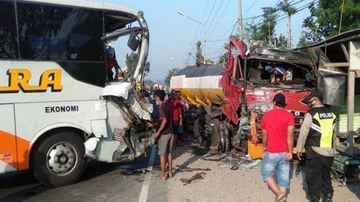 Bus Mira menabrak truk tanki yang diparkir itu tepatnya terjadi di Jalan Raya Ngemplak, Pagerwojo, Perak, Kabupaten Jombang, Minggu (8/8/2021).