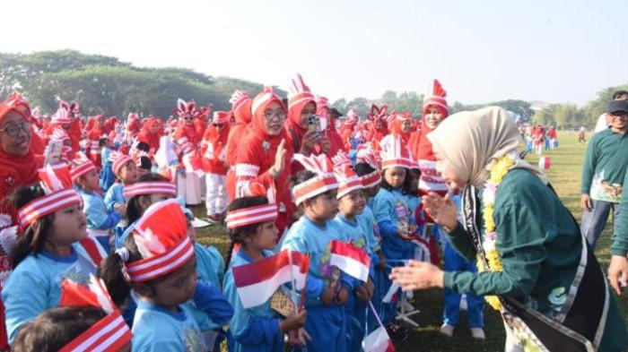 Sekira 5.000 anak ikut meramaikan peringatan Hari Anak Nasional yang digelar di lapangan Pasmar 2 Sidoarjo, Sabtu (9/8/2025).